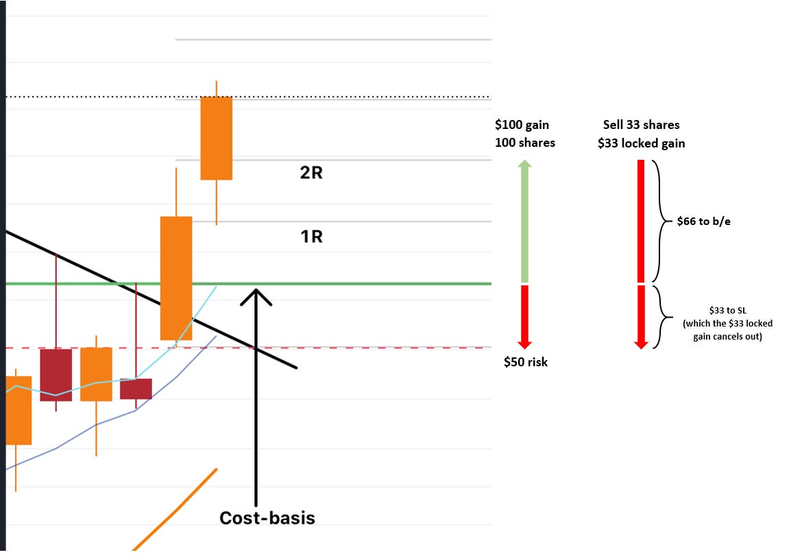 The art of selling isn’t only about locking in profits, but it’s also about portfolio protection. So I at least wanted to do a very short write-up to touch on how to de-risk your portfolio quickly by scaling out (selling a portion) of a position. This will allow you to hold onto a position with its original stop-loss location intact - thus giving it some more room for fluctuation - and get a financed (free) opportunity to ride it out for a longer move.
