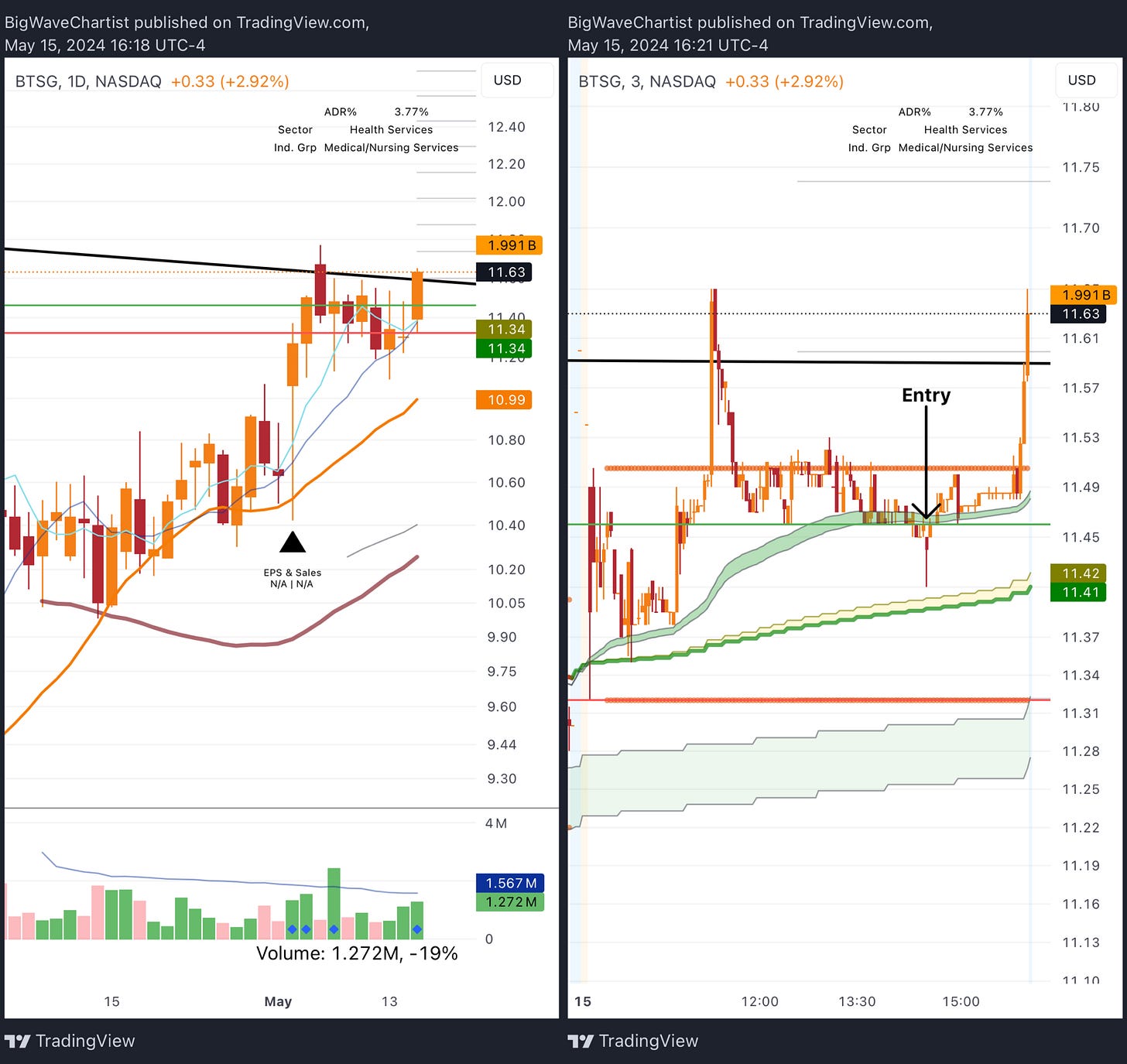 Today I opened a position in BTSG on a hammer bar entry on the intraday chart (please see charts below). I didnāt manage to de-risk it but it closed with great cushion so I hung onto it.