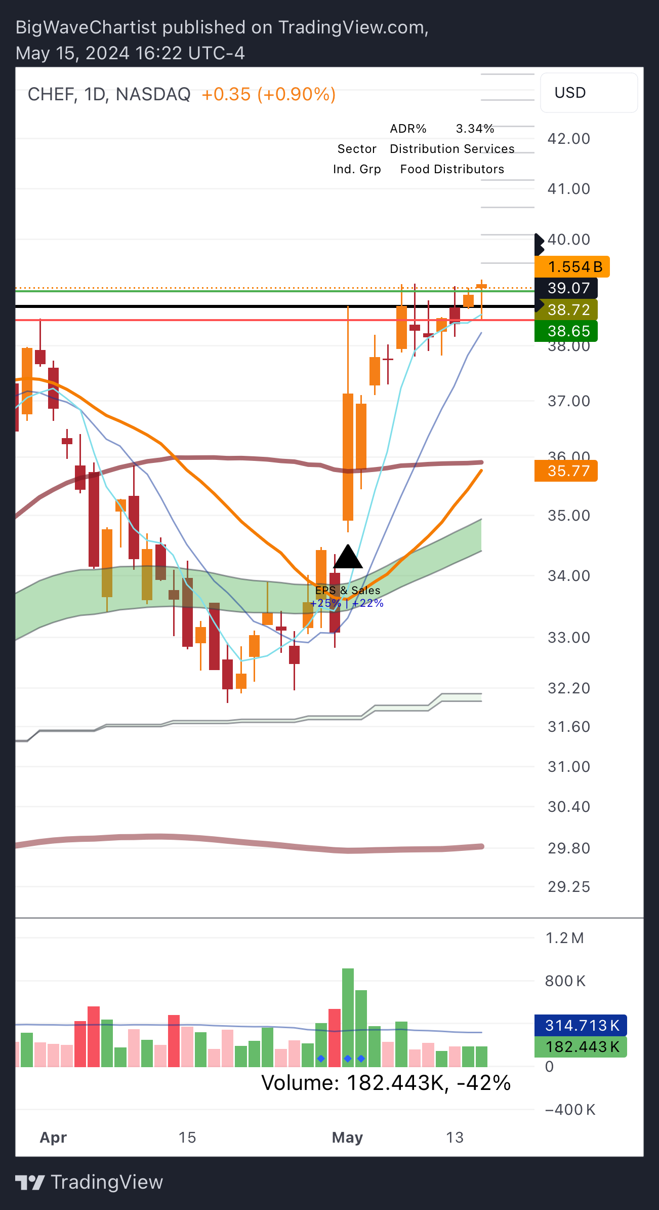 I opened CHEF on a daily hammer bar and near breakout of the long-flat base I spoke of on my weekend āChart Talkā article. I hung onto it because it closed very strong.