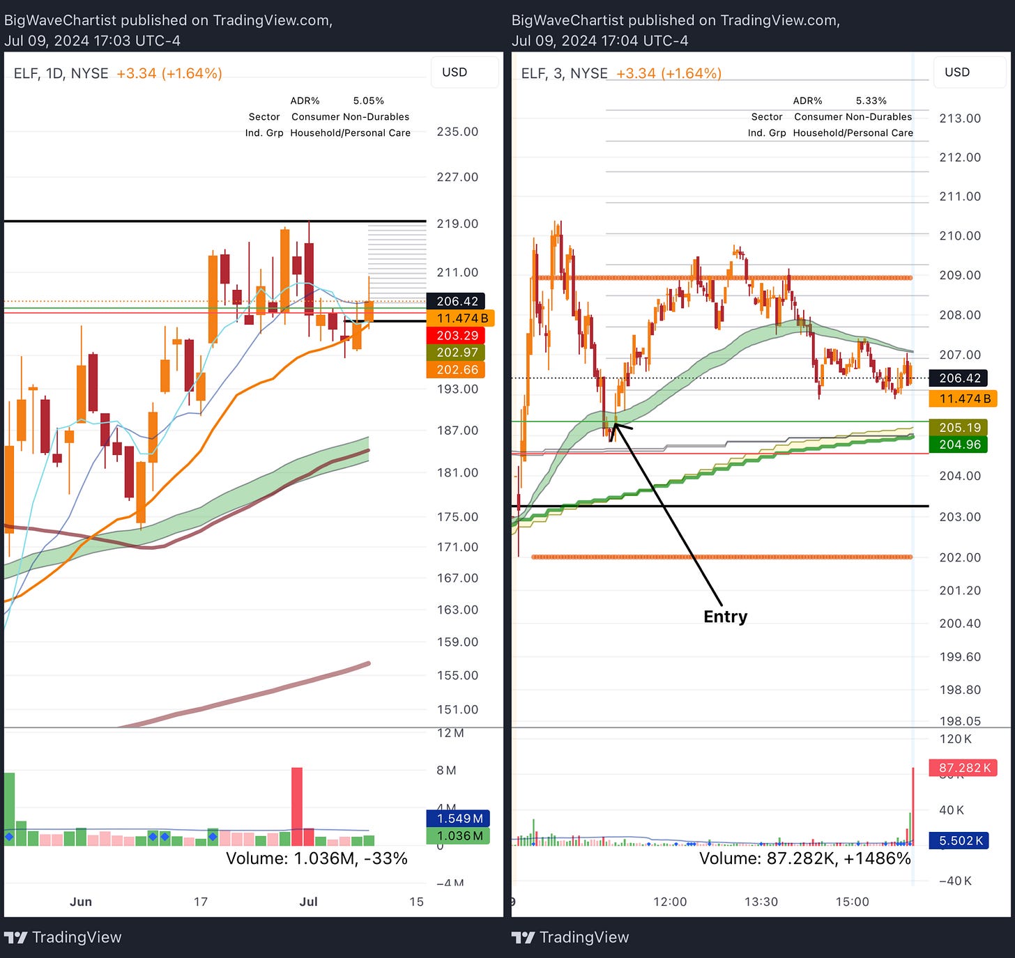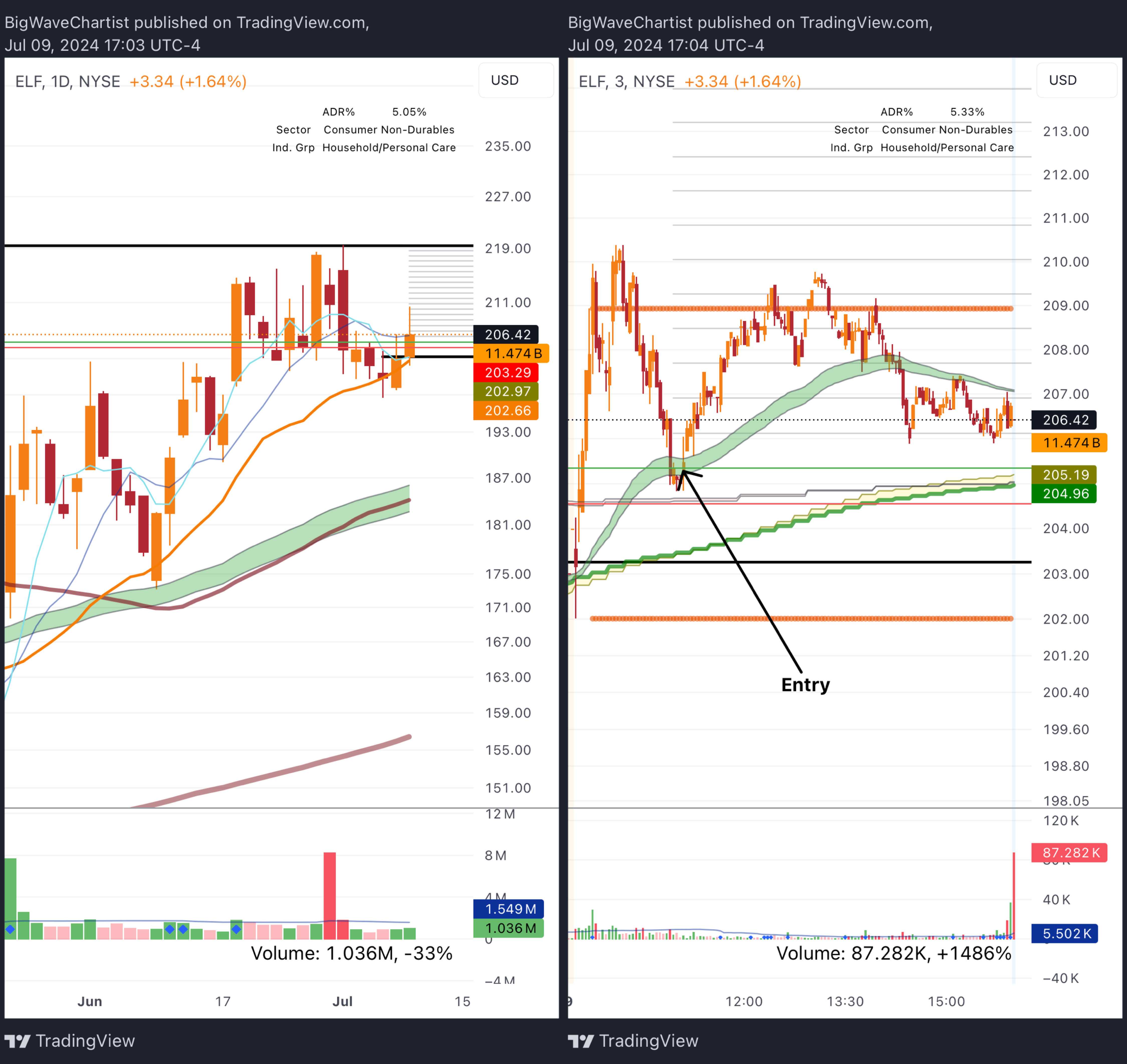 I went long ELF on a 20sma bounce on the daily and a green band bounce on the intraday chart. I de-risked it selling 1/3 at 2R (please see chart below).